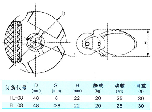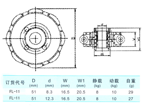 | 型號:FL-01 材質(zhì):608ZZ+POM或ABS 載荷:30kg 重量:35g | |