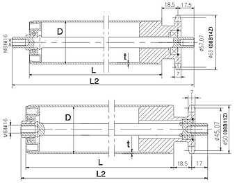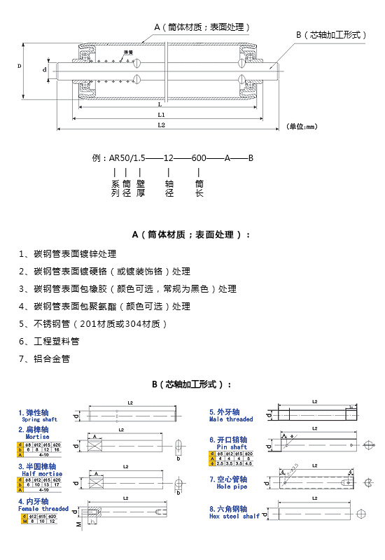 | 輥筒直徑D | 軸徑d | 壁厚t | 長度L | 長度L1 | 筒體材料 | 表面處理 |